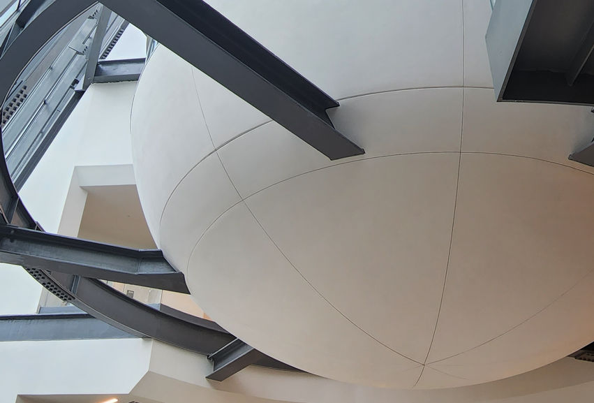 A large capsule including functional spaces across three levels, placed at the building's central atrium. Composite skin forming an ellipsoid, over a steel structure.